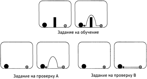 Эта способность видеть движение живых объектов глубоко укоренена в нашем мозгу. Уже к шестимесячному возрасту младенцы предпочитают смотреть на движущиеся светящиеся точки, которые образуют человеческую фигуру, а не на точки, которые движутся похоже, но размещены случайным образом. Даже кошек можно научить отличать светящиеся точки, образующие фигуру движущейся кошки, от таких же точек, размещенных случайным образом. Как движения могут выдавать намерения Задача распознать кошку по ее движениям ничем не отличается от задачи распознать кошку по форме ее тела или по издаваемым ею звукам. Чтобы узнать, что творится в окружающем мире, наш мозг готов пользоваться любыми сигналами поступающими извне. Сложные движения – одна из тех вещей, к которым наш мозг особенно чувствителен. Способность распознать в одном объекте кошку, а в другом – танцующую женщину еще не дает нам доступа во внутренний мир убеждений и намерений других людей. Но, наверное, способность распознать кошку, которая подкрадывается к добыче, или женщину, которой грустно, уже подводит нас к границе чужого внутреннего мира. В этих примерах видимые нами движения кое-что говорят нам о намерениях кошки и о чувствах женщины. Даже очень простые движения могут сообщать нам что-то о целях и намерениях других. Дьёрдь Гергей и его коллеги показывали двенадцатимесячным младенцам небольшой фильм (см. "Задание на обучение" на рис. 6.2). Вначале были видны маленький серый мячик и большой черный мячик, разделенные барьером. Затем маленький мячик перепрыгивает через барьер и останавливается возле большого черного мячика. Младенцы смотрят этот ролик несколько раз, пока он им совсем не наскучит. Затем им показывают новый фильм, с такими же мячиками, но без барьера.