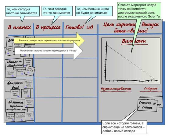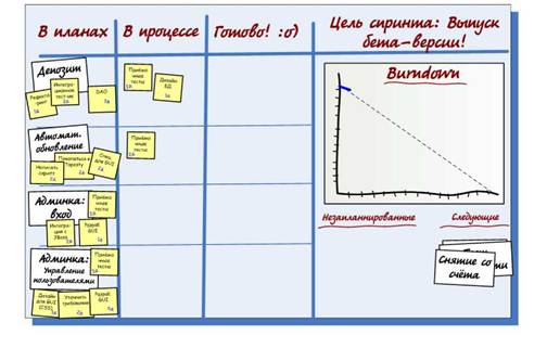 Как мы создаем sprint backlog Уже добрались до этой главы? Отлично! Итак, мы только что закончили планирование и протрубили на весь мир про начало нашего новоиспечённого спринта. Теперь настал черёд ScrumMaster'а создать sprint backlog. Это необходимо сделать после планирования спринта, но до начала первого ежедневного Scrum’а. Формат sprint backlog’а Мы поэкспериментировали с разными форматами sprint backlog’а, включая Jira, Excel, не забыли попробовать и обычную настенную доску. Сперва в основном использовали Excel, в интернете можно найти довольно много Excel'евских шаблонов для sprint backlog’а, с авто-генерацией burndown диаграмм и всякими другими примочками. Я мог бы долго рассказать про sprint backlog’а, созданные при помощи Excel, но я не буду. Даже не стану приводить примеров. Вместо этого я опишу во всех подробностях формат sprint backlog’а, который мы сочли наиболее эффективным — доску задач на стене. Найдите большую стену, на которой либо ничего нет, либо висит всякая ерунда вроде логотипа компании, старых диаграмм или ужасных картинок. Очистите её (если необходимо, спросите разрешения). Склейте скотчем большущее полотно бумаги (как минимум 2x2 или 3x2 метра для большой команды). А потом сделайте что-то вроде этого: Как вариант, можно использовать белую доску. Но такое её использование неэффективно. Если это возможно, сохраните белую доску для набросков будущего дизайна, а в качестве доски для задач используйте «бумажные стены». Примечание: если вы пользуетесь стикерами для задач, не забудьте прикрепить их скотчем, или же в один «прекрасный» день вы найдете их аккуратной кучкой на полу. Как работает доска задач Вы, конечно, можете добавить любые дополнительные поля. Например, «В ожидании интеграционного тестирования» или «Отменённые». Но прежде чем всё усложнять, хорошенько подумайте, действительно ли эти дополнения так уж необходимы? Я понял, что простота крайне ценна в такого рода вещах, поэтому я делаю усложнения только в случае, если цена неделания слишком велика. Пример 1 — после первого ежедневного Scrum’а После первого ежедневного Scrum'a доска задач может выглядеть примерно так: Как видно, три задачи находятся «в процессе», то есть команда будет заниматься ими сегодня. Иногда, в больших командах, задача зависает в состоянии «в процессе» потому, что никто не помнит, кто над ней работал. Если такое случается часто, команда обычно принимает меры. Например, отмечает на карточке задачи имя человека, который взялся над ней работать. Пример 2 — еще через пару дней Через пару дней доска задач может выглядеть примерно так: Как видно, мы закончили историю «Депозит» (т. е. она была зафиксирована в системе контроля версий, протестирована, отрефакторена и т. д.) «Автоматическое обновление» сделано частично, «Админка: вход» начат, а «Админка: управление пользователями» еще нет. У нас возникло 3 незапланированные задачи, как видно справа внизу. Об этом полезно будет вспомнить на ретроспективе. Вот пример настоящего sprint backlog’а ближе к концу спринта. Он, в самом деле, становится довольно беспорядочным по ходу спринта, но ничего страшного, так как это ненадолго. На каждый новый спринт мы начинаем sprint backlog с чистого листа. Как работает burndown-диаграмма Давайте присмотримся к burndown-диаграмме: Вот о чем она говорит: • В первый день спринта, 1-го августа, команда определила, что работы осталось примерно на 70 story point