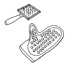 Для расчесывания шерсти кошки понадобятся следующие предметы: • металлическая расческа с редкими, длинными, слегка закругленными зубьями; • металлическая расческа с закругленными зубьями средней длины и частоты; • металлическая расческа с короткими, частыми, закругленными зубьями; • комбинированная массажная щетка с металлическими зубьями с антистатическим покрытием и натуральной щетиной (от нее образуется меньше статического электричества, чем от синтетической щетины); • скребок для удаления свалявшейся шерсти; • капроновая расческа; • перчатка для расчесывания шерсти. Не обойтись и без таких средств ухода, как тальк, кондиционер для шерсти, спрей-кондиционер для выгонки шерсти после линьки, спрей для удаления колтунов; увлажняющий, лечебный, восстанавливающий, обезжиривающий и увеличивающий объем шампуни, а также всевозможные бальзамы, кондиционеры и антистатики. Все эти товары можно приобрести в зоомагазинах, предварительно проконсультировавшись в клубе, членом которого является владелец. Чтобы облегчить процедуру расчесывания шерсти, надо посыпать ее тальком или кукурузным крахмалом, обработать скребком и только после этого несколько раз аккуратно провести металлической расческой с редкими зубьями по кошачьему меху в направлении роста остевых волосков. Расчесывание можно проводить поэтапно, разделив шерсть на проборы. Необходимо стараться прочесывать волоски по всей длине, чтобы удалить спутанные узелки (колтуны), появляющиеся на поверхности шерсти, если вовремя не удалить запутавшиеся листья и мусор. Следующий этап – тщательное вычесывание мелких узелков и удаление отмерших волосков с помощью металлической расчески с частыми зубьями. Такой инструмент необходим и при расчесывании воротниковой зоны, «штанов» и хвоста питомца, то есть участков, на которых шерстный покров восстанавливается гораздо медленнее. Можно воспользоваться на данном этапе и перчаткой для расчесывания шерсти: одновременно с выполнением первоочередной задачи, расчесывания, будет массироваться тело питомца. Как только остевые волоски будут распутаны, можно приступать к завершающему и, пожалуй, самому главному этапу процедуры расчесывания – обработке шерсти массажной щеткой с длинной ручкой. Расчесывание выполняется таким образом, чтобы шерсть питомца выглядела естественно, а не торчала в разные стороны и не стояла дыбом. Каждую зону кошачьего тела следует расчесывать в определенном направлении: • спину – от хвоста до холки; • бока – в направлении хвоста; • воротник – по направлению роста остевых волос вокруг головы; • грудь – от лап к подбородку; • живот – от груди к хвосту; • лапы – уложив животное себе на колени животом вверх. Процедуру начинают с задних лап: придерживая поочередно конечности, расчесывают «штаны» от подушечек лап к хвосту; затем переходят на передние лапы и вычесывают подмышки. Особое внимание следует уделить шерстке между пальцами, поскольку свалявшаяся здесь шерсть может причинить животному сильную боль. Если на хвосте нет колтунов и спутанной шерсти, его не трогают, а завершают процедуру поглаживанием щеткой по шерсти вверх и вниз, это позволит собрать пропущенные отмершие волоски. В зависимости от назначения и рекомендаций фирмы-изготовителя в процессе расчесывания или после его завершени