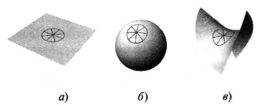 Ну, а что насчёт радиуса? Джим использует тот же метод определения радиуса, и нам, с высоты птичьего полёта, видно, что он получит такое же значение, которое получили мы. Причина состоит в том, что его рулетка располагается не по мгновенному направлению движения круга (как было при измерении длины окружности). Она направлена под углом 90 градусов к направлению движения и поэтому не сокращается в направлении своей длины. Следовательно, Джим получит точно такое же значение величины радиуса, какое получили мы. Но теперь, рассчитав отношение длины окружности колеса к его радиусу, Слим и Джим получат число, которое будет превышать полученное нами значение 2?, поскольку у них длина окружности оказалась больше, а радиус остался тем же самым. Что за чудеса? Как может быть, чтобы для какой-нибудь фигуры в форме окружности нарушалось установленное ещё древними греками правило, согласно которому для любой окружности это отношение в точности равно 2?? Вот объяснение Эйнштейна. Результат древних греков справедлив для окружностей, нарисованных на плоской поверхности. Но подобно тому, как кривые зеркала в парке развлечений искажают нормальную пространственную структуру вашего отражения, так и пространственная форма окружности исказится, если она будет нарисована на искривлённой или деформированной поверхности: отношение длины окружности к радиусу для такой окружности, как правило, не будет равно 2?. В качестве примера на рис. 3.2 приведены три окружности одинакового радиуса. Длины этих окружностей различны. Длина окружности (б), нарисованной на искривлённой поверхности сферы, меньше длины окружности (а), нарисованной на плоской поверхности, несмотря на то, что они имеют одинаковый радиус. Искривлённый характер поверхности сферы приводит к тому, что радиальные линии, проведённые из центра, слегка сходятся друг к другу, приводя к небольшому уменьшению длины окружности. Длина окружности (в), нарисованной на седловидной искривлённой поверхности, больше, чем длина окружности, изображённой на плоской поверхности. Свойства кривизны седловидной поверхности приводят к тому, что радиальные линии слегка расходятся, вызывая небольшое увеличение длины окружности. Эти наблюдения показывают, что отношение длины окружности к радиусу для (б) будет меньше, чем 2?, а для (в) — больше, чем 2?. Но отклонения от значения 2?, особенно в сторону увеличения, как в примере (в), — это как раз то, что было обнаружено в случае вращающегося аттракциона. Подобные наблюдения привели Эйнштейна к идее, что нарушение «обычной», евклидовой геометрии объясняется кривизной пространства. Плоская геометрия древних греков, которой тысячи лет учат школьников, попросту не применима к объектам на вращающемся круге. Вместо этого здесь имеет место её обобщение на случай искривлённого пространства, схематически показанное на рис. 3.2в.{16}