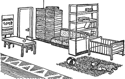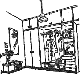 Как расставить мебель Создать интерьер, отвечающий всем современным требованиям, довольно трудно даже тогда, когда имеется выбор вещей. В каждом отдельном случае необходимо принимать во внимание возможности квартиры, пожелания и привычки членов семьи, их работу. Следует учитывать и возможности развития семьи, в жизни которой неизбежны перемены. Существует различный подход к выбору мебели. В одном случае может быть рекомендован набор, рассчитанный на всю квартиру, в другом — на каждую комнату отдельно (покомнатные наборы). Можно комплектовать наборы мебели из отдельных групп различного функционального назначения. Такой способ меблировки избавит семью от крупных единовременных затрат и, главное, позволит более тщательно продумать вопрос дальнейшей меблировки квартиры. Мебель нужно выбирать удобную и комфортабельную. Следует при этом учитывать, что обилие сверкающих полированных поверхностей утомляет зрение, делает интерьер беспокойным. При расстановке мебели обращайте внимание на фон стен, цветовое сочетание, расстояние и проходы между отдельными предметами и группами предметов. Проходы должны обеспечивать свободное движение по комнате, удобное пользование мебелью. А теперь давайте пройдем по вашей квартире и обсудим все вопросы, связанные с благоустройством и убранством ее. Нам бы хотелось, чтобы примеры и советы, приведенные в этой книге, натолкнули вас на мысль внести в оборудование вашей квартиры что-то свое, оригинальное, современное. Итак… Передняя Первое впечатление от вашей квартиры создается в передней, поэтому оборудовать ее надо особенно тщательно и рационально. Прежде всего в ней необходимо установить вешалку. В магазинах вешалки представлены в самых различных вариантах: подвесные или напольные, с задней стенкой и без нее. При отсутствии задней стенки у вешалки участок стены, находящийся за ней, рекомендуется закрывать, чтобы он не грязнился. Передняя, оборудованная четырьмя разнородными по материалу элементами. Однако они образуют единое целое. Для этой цели вы можете использовать полированную древесину, красивые плетеные коврики, слоистый пластик или просто кусок темной или узорчатой ткани с аккуратно подшитыми краями. Нельзя забывать и о специальной вешалке для детей. Это приучает их к аккуратности и самостоятельности. Сделать ее можно так: на вертикальные доски, прикрепленные к стене, набить горизонтальные рейки с интервалом 15–20 см, а в рейках сделать отверстия, куда вставить небольшие колышки с зарубкой на конце, чтобы одежда не соскальзывала. Древесину можно покрыть прозрачным лаком или выкрасить краской, можно даже яркого цвета. Если вы хотите увеличить емкость вешалки, полку для головных уборов сделайте из брусков и между ними разместите передвижные подвесные крючки, укрепив их на крупных пуговицах. Пуговицы надо подбирать выпуклые — это обеспечит более легкое и плавное их передвижение по брускам. Вместо пуговиц можно использовать крупные шарики бус. Общая глубина полки любой конструкции для шляп должна быть не менее 26 см. Практичная и простая схема вешалки. Удобна для всякой передней. Очень удобен для передней встроенный шкаф. Его можно использовать для хозяйственных нужд, а также для хранения лыж, удочек и других длинномерных предметов. Для хранения обуви удобен низкий шкафчик, в