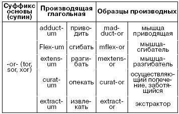 26. Существительные с общим словообразовательным значением «действие, процесс» В латинском языке есть существительные, которые имеют определенные суффиксы с общим значением «действие, процесс». ![]() 1. Существительные этого очень продуктивного словообразовательного типа обозначают операции, способы обследований, физиологические функции, лечения, теоретические понятия в различных дисциплинах: например, auscultatio – аускультация, выслушивание; percussio – перкуссия, постукивание; palpatio – пальпация, ощупывание. Все три термина обозначают методы исследования внутренних органов. Имеются производные на -io, обозначающие не только действие, процесс, но и результат этого действия, например, decussatio – перекрест (образование в форме X); impresso – вдавление; terminatio – окончание, конец. 2. Среди искусственно образованных слов на -io некоторые происходят не от глагольной, а от именной основы, например decapsulatio – декапсулация, оперативное удаление оболочки органа; hepatisatio – гепатизация, уплотнение легочной ткани. 3. Существительные с общим словообразовательным значением «предмет (орган, инструмент, прибор), которым производится действие; лицо, осуществляющее деятельность». ![]() 4. Существительные с общим словообразовательным значением «результат действия». ![]() |