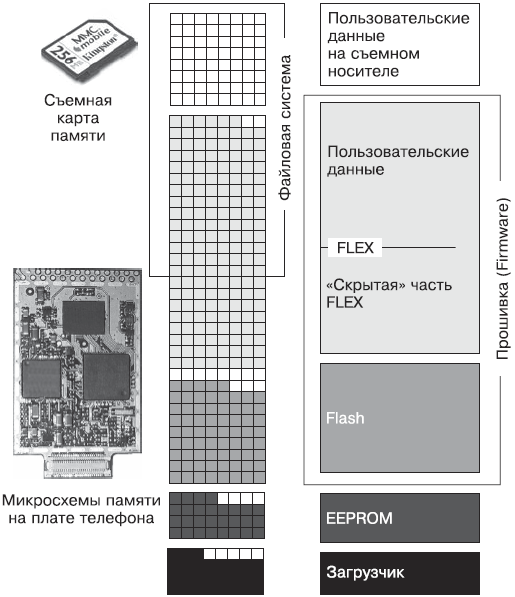Глава 7 ПЕРЕПРОШИВКА, ОБНОВЛЕНИЕ И ТЕСТИРОВАНИЕ ТЕЛЕФОНА В этой главе отправимся в довольно рискованный рейд по просторам вашего мобильного телефона. Перед подобной дорогой полезно ознакомиться если не с картой, то хотя бы с абрисом предстоящего маршрута. Освоение компьютера можно сравнить с путешествием, организованным туристической фирмой. Универсальный путеводитель по персональному компьютеру купить вполне реально – ведь в 99 % случаев ваша машина принадлежит к миру WIntel. Так в шутку говорят о компьютере, построенном на Intel-совместимой платформе и работающем под управлением операционной системы Windows. В этой книге всюду подразумевается именно подобная машина, а пользователям Apple Macintosh или операционной системы Linux приведенные описания программ и настроек вряд ли пригодятся. Создавать универсальное пошаговое руководство по освоению мобильного телефона практически бессмысленно, вскоре вы поймете почему. Воспользуемся опытом подготовки подразделений спецназа, которые, как известно, должны осваиваться, выживать и действовать в любых незнакомых условиях. Для этого, в первую очередь, надо знать общие принципы выживания и уметь добывать информацию любым доступным путем. Поэтому приготовьтесь к длинному теоретическому отступлению. Общие сведения об архитектуре сотового телефона Нет ничего практичнее, чем хорошая теория. Постараемся опираться на школьный курс информатики и ваш опыт работы с компьютером. Как уже сказано, принципы устройства и персонального компьютера, и мобильного телефона очень схожи. Вместе с тем мир мобильных использует немного другой подход к программному обеспечению и несколько иную терминологию. «Тело» и «душа» телефона С одной стороны, и компьютер, и телефон собраны из вполне вещественных деталей: микросхем, конденсаторов, печатных плат, проводов, кнопок и т. д. Специалисты по компьютерам или телефонам официально называют это аппаратной частью, или аппаратным обеспечением, а в разговоре издавна используют короткое слово «железо». Младшее поколение стало называть аппаратную часть мобильного телефона еще проще: «тело». Возможно, такой жаргон режет слух, зато очень точно отражает суть аппаратного обеспечения. Аппаратная часть действительно играет роль «тела» мобильного телефона или компьютера. Как вы догадываетесь, дальше нужно вспомнить о душе. В качестве «души» любого цифрового программируемого автомата выступает его программное обеспечение. Все телефонные (прием, передача и расшифровка сигналов, идентификация телефона в сети и др.) и все компьютерные функции (телефонная книга, голосовой набор, игры и др.) мобильного телефона зависят не только и не столько от аппаратной части, сколько от программного обеспечения. Главное отличие аппаратной части телефона и компьютера вовсе не в размерах, а в разнообразии. Подавляющее большинство компьютеров независимо от производителя построено на единой платформе, называемой x86. Процессоры компаний Intel и AMD являются прямыми потомками одной микросхемы, выпущенной более двух десятилетий тому назад. Чтобы удержаться на рынке, создатели компьютерных комплектующих вынуждены придерживаться множества открытых стандартов. В результате компьютер можно собрать из отдельных блоков – устройств, выпущенных самыми разными производителями. Поэтому и операционн