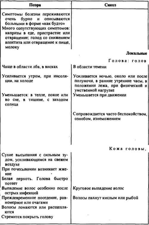 В связи с этим сегодня мы отказываемся от уникаузального объяснения хронического течения этих болезней, которого придерживался Ганеман в соответствии с пониманием того времени. Его обобщающие понятия псора и сикоз в языковом отношении не отягощены. Выражение «сифилис» принято для обозначения инфекции, в патогенезе которой играет ведущую роль инфицирование бледной трепонемой (спирохетой), поэтому сейчас для группы подобных болезней мы применяем термин сифилинии или люетический способ реагирования, люетическая почва. Характеристика течения болезни позволяет сразу подобрать терапию. Лекарство — вот решающий аргумент! Знаем ли мы причину, можем ли мы ее объяснить или нет, важно одно, что мы знаем лекарство для лечения. Первое большое средство в терапии псора — это Sulfur. При испытании действия Sulfur основные его проявления возникают на коже: она становится шершавой, не поддающейся лечению, с наклонностью к экзематозным изменениям, гнойным пустулам, образованию фурункулов. Сильный зуд, переходящий в жжение, приводит к расчесам. Он усиливается в теплой постели и при контакте с водой. Зудящие, приводящие к расчесам кожные проявления — это первые типичные признаки псора, получившей название «чесоточная болезнь». Вследствие подавления разгружающих кожных проявлений развиваются процессы на слизистых оболочках и внутренние болезни. Широкий спектр действия Sulfur показывает, что в патологический процесс могут вовлекаться почти все органы и ткани. Взаимосвязь между болезнями кожи, слизистых оболочек и внутренних органов дает нам представление о развитии псора и лечебном действии Sulfur при псорических болезнях. После лечения Sulfur подавленные болезни кожи и слизистых оболочек могут рецидивировать. При успешном лечении могут излечиваться вначале внутренние страдания, а затем кожа (правило Геринга). Благодаря исследованиям — August Bier (1949) мы знаем, что «вследствие приема простой серы повышается обмен серы и ее выведение. Что это означает? Я предполагаю, что у этих людей имеются ненормальные накопления серы в организме, что ее обмен у ню нарушен и что прием небольших количеств серы явился раздражителем, вызвавшим выведение избыточно накопленной в тканях серы». К псорическим лечебным средствам причисляются прежде всего элементарные вещества, которые необходимы для организма как материал или как выполняющие функцию катализаторов микроэлементы: Calcium, Kalium, Natrium, Magnesium, Silicium, Phosphorus, Sulfur, азот, углерод, их соединения и кислоты, алюминий, Antimonium crudum, Arsenicum album, Barium, Cuprum, Stannum, Zincum. Из растительных средств он особенно часто упоминает Lycopodium, Mezereum, Sarsaparilla. Его ученики отчасти изменили этот набор и расширили его. Каждое лекарство, спектр которого достаточно широк, чтобы охватить совокупность симптомов, может в отдельных случаях стать similia. Правило подобия также стоит выше теоретического понятия псора. Мы не назначаем псорического средства, если и предполагаем наличие псора, а назначаем его тогда, когда у псорического пациента совокупность симптомов соответствует псорическому средству. Тот аргумент, что типичные псорические лекарственные вещества являются строительным материалом организма или осуществляют функцию катализаторов, дает нам ключ к рациональному овладению псорическими нарушениями. Исследования A. Bier, посвященные обмену серы в органи