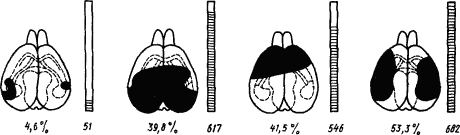 Рис. 35. Опыт с иррадиацией дифференцировочного торможения по корковым клеткам кожного анализатора: 0 — дифференцировочный раздражитель, 1, 2, 3, 4 — положительные условные раздражители (прикладываются к пунктам кожи ноги на расстоянии от дифференцировочного раздражителя соответственно на 3, 9, 15 и 22 см) В классических опытах Н.Н. Красногорского и Б.А. Когана условный рефлекс на каждую из положительных касалок составлял 5 капель слюны за 30 с. Но каждый раз, когда дифференцировочная касалка создавала очаг торможения, начинали изменяться и соседние положительные рефлексы. Следовательно, торможение выходит за пределы своего очага и захватывает соседние клетки анализатора, в данном случае те, на которые проецируются кожные пункты положительных касалок. Далее видно, что в одинаковых условиях минутного интервала после троекратного действия дифференцировочной касалки условные рефлексы с положительных касалок изменяются по-разному, в зависимости от расположения последних относительно дифференцировочной. Так, рефлекс с ближайшего пункта (касалка 1) оказался полностью заторможенным. Рефлекс с пункта, расположенного несколько дальше (касалка № 2), был только уменьшен. Рефлексы с остальных пунктов, расположенных еще дальше, не только не испытали торможения, но даже усилились. Следовательно, иррадиирующее торможение оказывает тем более сильное воздействие на клетки анализатора, чем ближе они находятся к тормозному очагу. По своей природе иррадиация торможения — это развитие ТПСП на все большей территории коры, но не истинное движение процесса. Концентрация торможения. После широкой иррадиации наступает сосредоточение, концентрация торможения в месте своего возникновения. Этот процесс тоже удобно проследить на примере дифференцировочного торможения в кожном анализаторе. Опыты проводили так же, как и при наблюдении иррадиации, но положительные рефлексы с каждого пункта кожи испытывали в различные сроки после окончания действия тормозного раздражителя. При помощи такого приема можно увидеть, как сначала далеко распространившееся тормозное состояние начинает сосредоточиваться, возвращаясь к исходному пункту. При своем концентрировании торможение проходит в обратной последовательности все те пункты проекционных полей анализаторов, которые оно захватывало в своем поступательном движении. Что собой представляет процесс концентрации торможения? Здесь не исключены две возможности. Первая заключается в том, что распространившееся торможение рассеивается, затухает на периферии и занимаемая им территория постепенно уменьшается. Вторая возможность — это подъем обратной волны торможения к тому месту, откуда оно распространилось. Последнее более вероятно, как, например, упрочение дифференцировки сопровождается усилением тормозного процесса. Следовательно, концентрация торможения связана не с рассеиванием и ослаблением, а с его сосредоточением и усилением. Скорость иррадиации и концентрации торможения в коре головного мозга собаки. Скорость иррадиирования тормозного состояния удалось измерить в кожном анализаторе. Для этого определяли время развития вторичного торможения условного рефлекса на раздражение пункта кожи, находящегося в известном удалении от первично угашаемого. Опыты проводили следующим образом. В ра