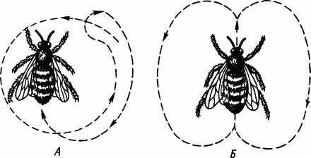 Не менее поразительно «коммунальное обслуживание» улья. В жаркий день тысячи пчел-вентиляторщиц выстраиваются длинными колоннами до самого летка и дружно работают крылышками, вызывая сильную тягу свежего воздуха. Пчелы-уборщицы чистят ячейки, подбирают со дна обрывки коконов, соринки и другой мусор. Готовя улей к зиме, пчелы-конопатчицы заделывают все щели и трещины, особенно в потолке, особым клеем — прополисом. Пчелы-водоносы пополняют запасы воды, сохраняемые в зобиках пчел-цистерн. Высокое совершенство инстинкта пчел легко переходит в бессмысленность поступков, если насекомое сталкивается с необычными условиями. Наиболее разительный пример можно привести из жизни пчелы-каменщицы. Если в дне сооружаемой ячейки проколоть дырочку, то пчела ее быстро заделает. Но если дырочку проколоть тогда, когда ячейка готова, и пчела наполняет ее медом и цветнем, то неутомимая работница целый день бьется в безрезультатных попытках наполнить ее, даже не пытаясь заделать отверстие, через которое вытекает мед. Когда строительный рефлекс вызвал следующий за ним рефлекс — заготовки корма, то он тем самым исключил себя из поведения насекомого. Неутомимо кладет яйцо за яйцом матка, заполняя за день до 3000 ячеек. Из них выводятся все новые рабочие пчелы. Первые 2–3 дня они занимаются лишь чисткой ячеек, в возрасте <...> дней начинают кормить личинок медом и цветнем и выделениями из особой железы — так называемым «молочком», с 10-дневного возраста строят соты и укладывают в них приносимые сборщицами мед и пыльцу. Около 20-го дня своей жизни пчелы отбывают краткосрочно сторожевую службу у летка. Наконец, с 20-дневного возраста они становятся сборщицами нектара или пыльцы и отправляются в полеты, постепенно увеличивая их дальность. Все это время молодые пчелы расширяют свой жизненный опыт, вырабатывая множество обходимых им условных рефлексов. Условные рефлексы. Одним из первых условных рефлексов, вырабатываемых вылетающей из улья пчелой, является фиксирование его местоположения. В первый раз молодая пчела отлетает только на 2–3 м от летка. Она висит 2–3 мин в воздухе головой к улью, после чего возвращается на соты. В следующий раз пчела отлетает подальше и находится в воздухе дольше. Она по-прежнему держит улей в поле зрения, не отворачиваясь от него. Постепенно радиус полетов увеличивается, пчелы начинают описывать все большие круги. Они связывают с местоположением улья основные ориентиры ближних, а потом и более далеких окрестностей. Молодая пчела, не прошедшая такого систематического курса обучения, заблудится, если ее отнести на 100 м от улья. В то же время взрослая пчела-сборщица безошибочно находит дорогу домой за многие километры. О том, что в основе реакции определения места улья лежат зрительные условные рефлексы, убедительно свидетельствует тот факт, что старые пчелы, переселившиеся на новое место, начинают выработку этой реакции сначала. Другое наглядное доказательство получено в опыте, когда на пути от пасеки через поле к кормушке с сахарным сиропом расставили вехи. Пчелы быстро наладили регулярные рейсы по этой трассе. Однажды вечером линию вех переместили в сторону. Вылетевшие утром пчелы направились туда, куда указывали теперь вехи, и долго кружились вокруг последней из них, указывавшей ранее место кормушки. Глаза пчелы состоят 