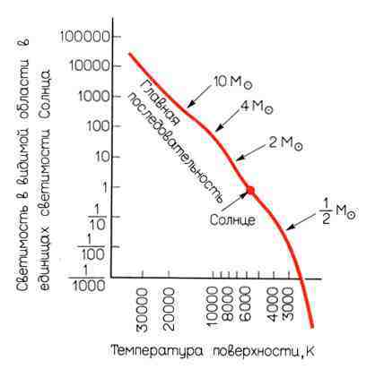 90 % всех звезд лежат в пределах указанной полосы. Астрономы называют эту полосу главной последовательностью. Сравнение с рис. 2.1 показывает, что Солнце, Сириус и Спика лежат на главной последовательности. В то же время холодные звезды в системе Дзета Возничего, а также Бетельгейзе и спутник Сириуса расположены за пределами главной последовательности. Звезды, которым соответствуют точки на главной последовательности диаграммы Г-Р, астрофизики называют звездами главной последовательности. Они-то в основном и составляют ближайшее окружение Солнца, а гиганты и карлики являются среди них исключениями. Звезды главной последовательности обладают одним важным свойством, которое связано с их массой. Мы знаем массу звезд лишь для некоторых из этих светил. Ее можно точно определить, только когда вокруг звезды движется спутник. Мы уже знаем, что траектории планет, движущихся вокруг нашего Солнца, позволяют вычислить его массу. Движение спутника Сириуса позволило нам узнать, что Сириус А содержит примерно в 2,3 раза больше вещества, чем Солнце, и что масса его спутника близка к солнечной. Этот метод дал возможность определить массу некоторых звезд (принцип, лежащий в его основе, коротко изложен в приложении В). Наиболее тяжелые звезды главной последовательности содержат примерно в 30–50 раз больше вещества, чем Солнце. Масса самых маленьких звезд составляет несколько десятых солнечной массы. Для звезд главной последовательности, масса которых была определена по движению их спутников, выполняется важная закономерность: в каждой точке главной последовательности расположены звезды с определенной массой (рис. 2.3). Звезды с малой массой расположены внизу, а наиболее тяжелые звезды-вверху. Если идти вдоль главной последовательности снизу вверх, то масса звезд постепенно возрастает. Поскольку при этом увеличивается и светимость звезд на диаграмме Г-Р, то можно сказать: чем выше светимость звезды главной последовательности, тем больше ее масса. Если сравнить две звезды главной последовательности, то у звезды с большей светимостью и масса будет больше. Пойдем и дальше: массу звезды можно непосредственно определить по ее светимости, если известно, что звезда принадлежит к главной последовательности. На рис. 2.4 показано, как возрастает светимость с увеличением массы звезд главной последовательности. Астрономы называют эту закономерность диаграммой масса-светимость. В частности, эта закономерность выполняется для звезд, которые нам уже знакомы: речь идет о Солнце, Сириусе А и Спике, которые принадлежат к главной последовательности. Для белого карлика Сириус В этот закон не выполняется — звезда не лежит на главной последовательности.