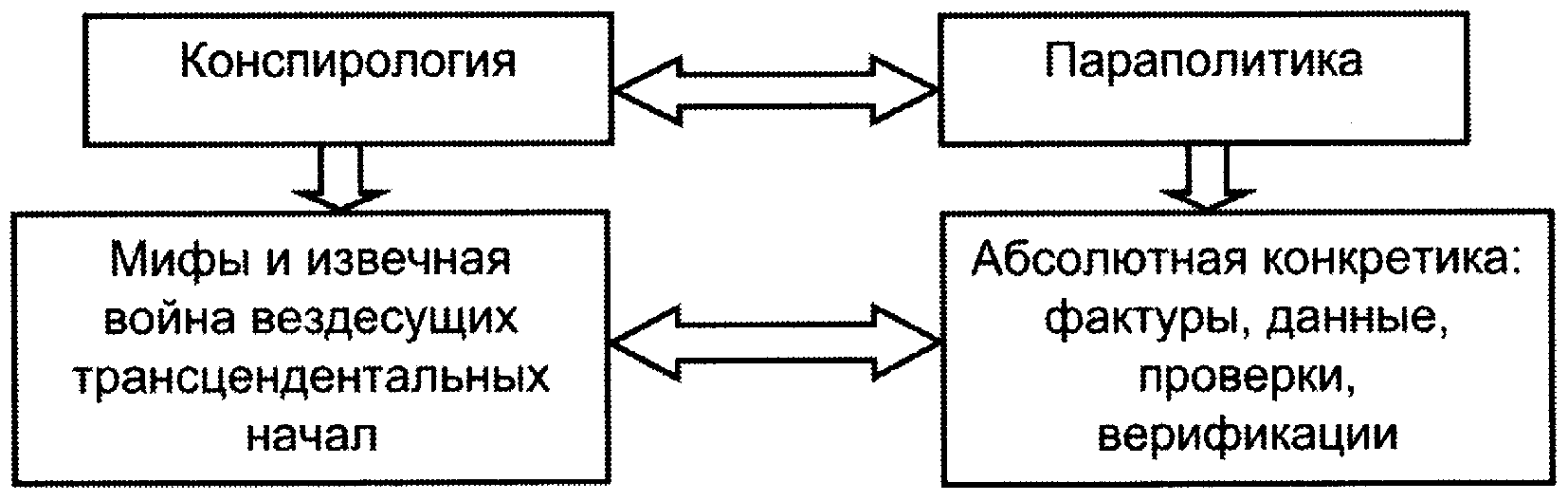 Дав столь обширные цитаты из left.ru, я просто вынужден предложить адекватный этому объему комментарий. И при этом апеллировать к уже… ну если не созданному, но эскизно очерченному мною аппарату социальной теории. Прежде всего, о том, почему яркие фантазии, подобные тем, которые представил left.ru, так поражают умы элиты. А то, что они поражают, мне известно не понаслышке. Чтобы понять природу данного явления, нужно еще раз обсудить, чем конспирология отличается… нет, не от параполитики (это мы уже обсудили), а от нормальной социальной теории (теории элит, теории закрытых социальных систем, теории игр и так далее). Конспирология сильна тем, что создает мифы. Миф — это не теория. Это яркая лубочная картинка, призванная заполнить вакуум непонимания, существующий в тех или других слоях общества. В том числе в тех слоях общества, которые именуют себя элитой. До поры до времени эти слои создавали схемы, позволяющие как-то объяснять, что именно происходит. Ну, например, лжеконцепт о борьбе чекистов и либералов. Лжеконцепт — это не миф. Это ложная, упрощенная и извращенная теоретическая конструкция. Когда эта конструкция рушится, то ее место должна занять другая конструкция. Тоже теоретическая. Но поскольку такая конструкция слишком сложна, то сознание соответствующих слоев общества (элитных в том числе) не может с нею адекватным образом соединиться. Мир и вправду непрозрачен. Конспирологи, настаивая на этом, не врут. Их вранье начинается чуть позже. Когда они начинают утверждать, что мир и непрозрачен, и примитивен. Мир на самом деле непрозрачен и страшно сложен. Конспирологи ненавидят сложность. Они не могут ею овладеть сразу по многим причинам. Прежде всего потому, что, как только возникает сложность, их объяснительные схемы (они же мифы) рассыпаются. Далее — потому, что эта сложность очень опасна. Кроме того, путь к этой сложности лежит через соответствующий инструментарий. Что такое данные? Что такое метод? Все проблематично. И недоступно. И, наконец, конспирология — это не вещь в себе. Конспирология — это служанка определенных господ. Для того, чтобы реальный подковерный процесс был скрыт, нужны мифы. Эти мифы должны канализировать общественное внимание в нужные зоны. А также отсечь эти зоны от всего, что находится за ними (рис. 51). Рис. 51 Итак, сначала возникает ложная теоретическая схема. Потом схема рушится и на ее месте возникает вакуум. Этот вакуум должна заполнить теория, дающая правильное объяснение. Такая теория сложна. А значит, недоступна сознанию тех, кто осваивает реальность. Тогда вместо теории предлагается миф. Этот миф на то и миф, чтобы находиться вне критики. Вы сказку о бабе Яге можете критиковать? Не можете? Миф концентрирует общественное внимание на некоей зоне. То есть отвлекает это внимание от других зон. Кроме того, миф (именно потому, что он миф) отсекает от этих зон нечто, адресующее к реальному масштабу проблемы. Зачем «пиплу, хавающему миф» (прошу прощения, интеллектуальной элите), реальная проблема в ее подлинном объеме и многомерности? Сознание лопнет! Это называется «когнитивный шок». Кроме того, хозяева не хотят обнажить масштаб проблемы. И, наконец, соединение с проблемой рождает серьезные социальные последствия. Соединится сознание с проблемой — что оно будет делать дальше? Поэтому миф полезен, желанен и удобен. Эт