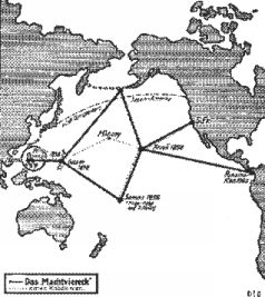 Пантихоокеанские силовые направления США: Американский четырехугольник Das Machtviereck – четырехугольник, дающий власть (всемогущество) Amer. Kabellinien – американские кабельные линии В таких событиях ослабления напряженности ясно проступает отчетливо переносимая из чисто духовной позиции в пространственно-политическую область трансформированная и картографически зримая, находящаяся на подъеме сила культурно-политической панидеи, чья опорная точка для перенесения – прежде “сего благоприятное расположение Гавайских островов и неразумность включения Филиппин, принадлежащих к Восточной Азии, в силовую структуру западной части Тихого океана, даже если это зафиксировано в столь убедительной с военно-политической точки зрения форме, как “Американский четырехугольник” (“American Qudrilateral”) на больших морских просторах. Особый вопрос (Anhaftepunkt), имеющий трансокеанское морское значение (впадина!), также непременно сохраняется, упраздняется лишь пространственно-политическая нагрузка архипелага: иными словами, победа океанской тенденции над континентальной, над [с.298] пространством вместо состояния с трогательной примесью империалистического духа. Несомненно, пантихоокеанская идея – охватывающая в равной мере и сам океан и прилегающие к нему районы и побережья, – чисто географическая панидея, являлась как бы континентальной; в то же время для паназиатской, как и для панамериканской, исключительности она имеет нарушающее, наступательное воздействие; и, конечно, пантихоокеанскую компромиссную мысль ощущали некоторые панидеи старого стиля в их стремлениях к власти, как колониальные империи и осколки колониальных империй Великобритании, Франции, Голландии, Португалии, а также великояпонские, малайско-монгольские мечты о будущем и жаждущие обновления носители сохранившегося в памяти китайского имперского мышления. И все же мы считаем Тихоокеанский союз как морское, панокеанское движение самым сильным сегодня на Земле, в своем роде доступным пониманию, несмотря на кажущееся картографически более впечатляющим формирование империи Индийского моря, внутренняя, идеологическая несвязность которой слишком очевидна и которая, как ее многие предтечи в Индийском океане, в конце концов растворилась в сети особых опорных пунктов, отдельные из коих рано геополитически выделились и стали весьма устойчивыми, даже меняя своих хозяев. Пантихоокеанское движение, в особенности с британскими идеями морской империи, занимающими второе место на буксире, со склонностью к эволюции, является будущим достойным противником крупнейшей революционной континентальной панидеи: и та и другая исходят от держав, не входящих в Лигу Наций! Наконец, в какой высокой степени охватывающая весь мир, объединенная океаном совокупность рассеянных владений, как Британская империя, в меньшей степени предшествовавшие ей заморские образования с опорными пунктами или крупные опорные части империи, нарушая, проникали в чужеземные панобразования, пока они сами не стали таковыми (пан-Британия, Великая Британия) или таковыми сумели себя сотворить (австралийское Сообщество), об этом свидетельствует любая добротная карта империи, любая из многих, здесь не названных работ, которые рассматривают такое строительство, вероятно лучше всего – статья в “Economist” “The evolution of the colo