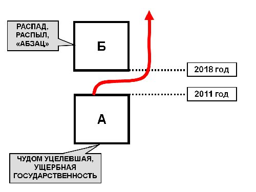 У нас в силу самых разных обстоятельств есть некоторый, очень маленький, но исторически существенный промежуток примерно в 7 лет – с 2011 года, когда ведётся этот разговор, до 2018-го. И за этот промежуток можно плавно, изящно достаточно, обогнуть это «Б» и выйти куда-то ещё. Просчитав траекторию так, чтобы нагрузки на систему не были предельными, чтобы система не развалилась. И чтобы мы не залетели снова в это «Б», пытаясь от него шарахаться, а действительно, обогнув его, пришли куда-то.