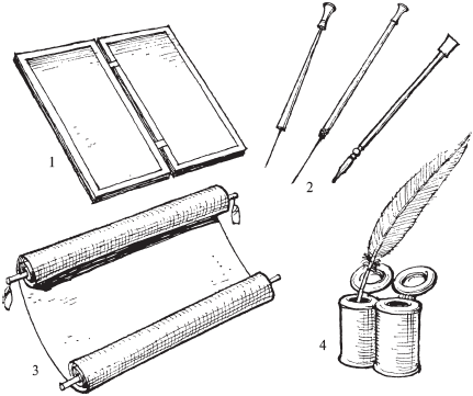 Книги и чтение Будет неверно считать любовь к литературе незначительной среди очень здравомыслящих римлян в дни ранней республики на том основании, что, насколько мы можем судить, литература волновала лишь меньшинство. Использование папируса, от которого произошла наша бумага, было важнейшим изобретением; как указывал Плиний Старший, блага цивилизованной жизни в значительной степени зависят от использования бумаги. На рынках Рима продавалось много сортов писчей бумаги. Лучшая делалась из сердцевины папируса и называлась «hieratica», потому что использовалась исключительно для священных книг. Судя по Плинию, одному бывшему школьному учителю и вольноотпущеннику удалось сделать первоклассную бумагу из третьесортной сердцевины. Его бумага широко продавалась и была известна под названием фанниева (fanniana) бумага. Как нам известно от Катулла, тогда, как и сегодня, использованная бумага применялась, по его словам, в качестве «обертки для макрели», а также в гигиенических целях (в туалетах). Черные чернила, надписи которыми остались разборчивыми до сего дня, изготавливались из сажи, смолы, дегтя и чернил осьминога. Плиний свидетельствует, что в I веке н. э. чернила ввозились из Индии, хотя говорит, что не знает, как они изготавливались. Похоже, он перепутал их с фиолетовой краской индиго. Ручки обычно были из тростника или перьев, остро заточенных, подобно гусиным и индюшачьим перьям наших не столь далеких предков. Писателям требовалось небольшой сундучок, полный этих обязательных инструментов их ремесла. Стиль – stilus, заостренная тонкая палочка из дерева, слоновой кости, камыша или металла – использовался для выцарапывания посланий, или memoranda, на покрытых воском деревянных табличках, которые скреплялись друг с другом шнурами, позволяющими поворачивать их как на шарнирах. Сенека говорит, что собрание таких табличек в старину называлось «caudex». Отсюда происхождение слова «кодекс», используемого позднее для обозначения книги со страницами вместо свитка. Обычно свиток писался только на одной стороне столбцами длиной от 2 до 3 дюймов; в столбце было от 25 до 45 строк. Нормальный размер почерка обычно позволял написать приблизительно от 18 до 25 знаков (букв) в строке. В более качественных манускриптах большое внимание уделялось правильному соотношению полей вверху и внизу, а также расстоянию между колонками. Использовать обратную сторону для письма было невыгодной экономией, поскольку свитки были полупрозрачными. Тем не менее школьные упражнения в письме и счете можно было найти на оборотной стороне некоторых свитков. Один свиток обычного размера содержал целую книгу Библии длиной с Евангелие от Матфея. На длинное произведение, такое как полная история Ливия, потребовалось бы 142 свитка, что было слишком для библиотеки бедняка, как сетовал Марциал. Обращаться с такими «книгами» было очень неудобно. Для того чтобы найти необходимый отрывок или ссылку, нужно было разворачивать весь свиток целиком. Папирусное полотно не так легко рвалось, как наша бумага, но трудно поверить, что оно смогло бы выдержать такое же постоянное использование, какое выдерживает книга. ![]() Рис. 51. Письменные принадлежности: 1 – восковые таблички; 2 – стиль; 3 – папирусный свиток; 4 – чернильницы и перьевая ручка Вызывающей удивление стороной этих древних свитков, мног