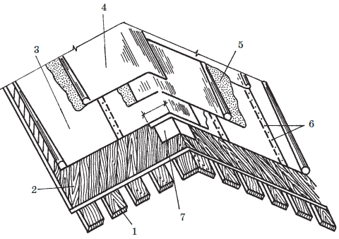 Поверхность очищенной от мусора и пыли стяжки грунтуют полосами шириной 4–5 м. Время высыхания грунтовки на старых стяжках – 12 часов на свежеуложенных – до 48 часов. В местах примыкания крыши к вертикальным стенам или выступающим деталям устанавливаются переходные бортики из цементно-песчаного раствора с уклоном до 100 %. Перед началом кровельных работ основание и бортики огрунтовывают. Грунтовку производят холодным битумным составом, который готовят введением в растворитель (керосин) тонкой струей расплавленный при температуре 220 °C битум и одновременно перемешивают получаемый состав. Затем, после остывания до температуры 16–20 °C грунтовка готова для нанесения на поверхность. Она должна быть жидкой, однородной, без видимых комков нерастворенного битума, должна свободно наноситься на поверхность малярной кистью. Расход такой грунтовки примерно 200 г/м2. Готовая грунтовка может храниться в герметично закрытых емкостях. Состав грунтовки тот же, что для оснований под рулонную кровлю. Дерево, как строительный материал, не относится к числу долговечных материалов. Однако, при правильном выборе этого материала, его выдержке в воздушных условиях и применения в рациональных конструкциях, срок службы дерева может достигать нескольких столетий. Основанием тесовой деревянной кровли может быть обрешетка из брусьев 60x60 мм или жердей диаметром 70 мм, обтесанных на два канта. Обрешетка прибивается к стропилам, уложенным с уклоном не менее 80 %, с шагом 600–700 мм. Основание под стальную кровлю Стальная кровля применяется преимущество на крышах со сложной геометрией, а листы оцинкованной стали используются также для устройства карнизных свесов, разжелобков, ендов, настенных желобов и водосточных труб независимо от типа кровельного покрытия. Основание для металлической кровли выполняется из брусков сечением 50x50 мм или досок размером 50х(120–140) мм, которые укладываются с шагом 200–270 мм (рис. 22). Под лежачие фальцы прокладывают доски шириной 100–120 мм. Устройство обрешетки ведут в направлении от карниза к коньку. Свес крыши по всему периметру обивают сплошным дощатым настилом шириной 70 см. Вдоль конька и ребер укладывают по две доски, соединенные встык. На разжелобках и ендовах устраивают дощатые настилы шириной до 80 см.