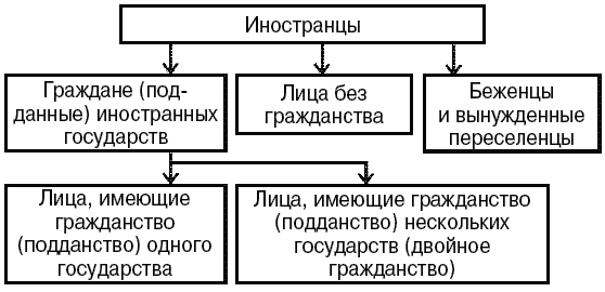 13. КЛАССИФИКАЦИЯ ФИЗИЧЕСКИХ ЛИЦ С ТОЧКИ ЗРЕНИЯ МЕЖДУНАРОДНОГО ЧАСТНОГО ПРАВА Группы физических лиц, участвующих в гражданско-правовых отношениях с иностранным элементом: • граждане РФ; • иностранцы. Иностранцы – все физические лица, не принадлежащие к гражданам РФ, поскольку именно это обстоятельство в основном и определяет специфику их правового положения в МЧП. Проведя дальнейшую классификацию физических лиц – участников отношений, выходящих за рамки одной национальной юрисдикции, мы можем выделить в группе «иностранцы» следующие категории лиц (см. рисунок). Наибольшее значение для механизмов правового регулирования МЧП имеет разделение иностранцев на граждан иностранных государств и лиц без гражданства. Эта классификация обусловлена прежде всего правовым статусом физических лиц, их связью с каким-либо государством и особенностями коллизионного регулирования. Классификация физических лиц с точки зрения международного частного праваКроме того, среди иностранцев можно выделить проживающих (постоянно или временно) и пребывающих лиц. Отнесение физических лиц в данном случае к той или иной категории преимущественно обусловлено спецификой их правового положения и особыми правилами пребывания, которые они должны соблюдать. Коллизионно-правовое и материально-правовое регулирование правового положения физических лиц может определяться самыми разными источниками МЧП. |
