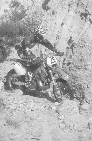 Поскольку ветви обычно встречаются в затененных, иногда очень темных местах, крайне важно постоянно внимательно смотреть по сторонам. Там где есть деревья, обязательно найдутся и их корни. Помните, что чем ближе вы к дереву, тем они крупнее. К сожалению, корни могут быть незаметны из-за листвы или недостатка света. Небольшие веточки и листья могут создать ложное чувство безопасности, но одной встречи с корнями обычно бывает достаточно, чтобы запомнить, чем это чревато. ДеревьяКамни Трудно поверить, но стометровый участок с камнями может принести проблем, как для гонщика, так и для мотоцикла не меньше, чем стокилометровый участок нормальной трассы. Камни тяжелее и тверже других элементов окружающей среды, следовательно, несут больше повреждений даже на низких скоростях. ![]() Камни печально известны за способность ломать технику и кости; на этой фотографии слишком знакомая картина. Даже небольшие камни на низкой скорости могут ломать стопы, разбивать глушители, гнуть подножки и педаль тормоза, деформировать картер Камни сложны тем, что в отличие от большинства поверхностей, они абсолютно неподвижны. Амортизация по большому счету не знает, как реагировать на контакт с чем-то, что не хочет поддаваться, хотя бы даже чуть-чуть. Рассмотрим пример. Песок по своей природе способен поглощать массу энергии. Поэтому вы можете прыгать выше, зная, что при приземлении поверхность смягчит часть удара. Камни в то же время скорее отклонят вилку, чем позволят ей смягчить удар. Поэтому большинство профессиональных гонщиков согласны с тем, что камни – дело тонкое. Использование одной лишь грубой силы, это прямой путь к травме. В большинстве случаев предпочтительно стоять, слегка сместившись назад. Это немного разгрузит передок и позволит вилке работать более эффективно. Кроме того, переднее колесо и вилка будут не так сильно отскакивать от препятствий, чем при загруженном переде. ![]() Необходимо быть внимательным на случай прячущихся камней. Эта 100-килограмовая глыба была покрыта мхом и прикрыта веткой. Она разнесет все, что ее коснется ![]() Если найдется достаточно ровная траектория, позволяющая ехать сидя, все равно будьте внимательны. В этом повороте Тай Дэвис решил, что проходить его лучше сидя, так как стоя было бы довольно сложно перенести ногу через камень. Заметьте, что поднимая высоко ногу, Дэвис не использует руль в качестве опоры “Старайтесь не напрягаться при езде по камням, – рекомендует Тай Дэвис, – это, наверное, типичная проблема, потому что почти все крайне боятся падения и потому держатся очень жестко. Сначала это может показаться сложным, но позвольте мотоциклу самостоятельно работать под вами. Большинство мотоциклов, при предоставлении им свободы прилично справятся с ездой по камням”. Еще одна основа – выбор траектории. В общем-то прямой путь намного проще извилистого. Повороты лишь ухудшат работу подвески и покрышек, что в итоге осложняет задачу. Обычно наилучшим путем является кратчайший, но все зависит от размера камней. Как правило, больших камней следует избегать. Они могут нанести травму вам или повредить мотоцикл. Если приходится ехать мимо камней с высотой на уровне или выше подножек, Дэвис советует “направлять носки вверх. Вы не представляете, сколько людей сломали кости стопы о предметы, которых они не заметили”. !