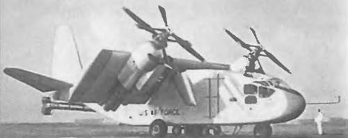 Хиллер Х-18 Экспериментальный СВВП с поворотными крылом и винтами Вторым экспериментальным СВВП с поворотным крылом и винтами в США (после СВВП Вертол VZ-2) стал экспериментальный транспортный СВВП Хиллер Х-18, разработанный по контракту с ВВС США для исследования возможностей использования тяжелых транспортных СВВП такой схемы. По требованиям ВВС, выданным известной вертолетостроительной фирме «Хиллер Эркрафт» в начале 1956 г., предусматривалась разработка и постройка экспериментального СВВП с взлетной массой 15 т. До этого фирмой «Хиллер Эркрафт» начиная с 1953 г. был разработан ряд различных проектов СВВП с поворотным крылом и винтами. По заказу научно-исследовательского отдела флота и при поддержке армии и ВВС США фирмой «Хиллер» был разработан проект транспортного СВВП взлетной массой 26 т с поворотным крылом и винтами. Проект получил фирменное обозначение Хиллер 1048 и представлял собой моноплан с высокорасположенным крылом, на котором в гондолах размещались четыре сдвоенных ТВД, приводящих соосные винты большого диаметра. Модели транспортного СВВП Хиллер 1048 с четырьмя ТВД (а) и легкого многоцелевого СВВП Хиллер 1045 с двумя ТВД (б) Фирмой «Хиллер» был спроектирован также легкий двухвинтовой вертикально взлетающий самолет, получивший обозначение Хиллер 1045. Вертикальный взлет и посадка у этого самолета обеспечивались также поворотом крыла с винтами на 90°. Вращение винтов предполагалось связать между собой механической трансмиссией, с помощью которой должен был обеспечиваться привод небольших рулевых винтов, установленных на хвосте самолета. Для упрощения и ускорения разработки экспериментального СВВП Х-18 был использован фюзеляж десантно-транспортного самолета Чейз YC-122, а в качестве силовой установки были применены два ТВД Аллисон Т-40-А-14 мощностью по 5850 л.с, использовавшиеся па экспериментальных СВВП Конвэр XFY-1 и Локхид XFV-1, и такие же, как на этих самолетах, соосные винты диаметром 4,88 м. Экспериментальный транспортный СВВП Хиллер Х-18 Постройка СВВП Х-18 была завершена в середине 1958 г., и после длительных наземных испытаний он совершил первый полет 24 ноября 1959 г., взлетая с разбегом, на авиабазе ВВС им. Эдвардса. До июля 1961 г. было совершено 19 полетов с максимальным углом поворота крыла на 33°, с учетом угла тангажа фюзеляжа 17°, максимальный угол атаки крыла достигал 50°. Самолет пилотировали летчики ВВС Джордж Грайт и Брус Джонс. В полетах были достигнуты максимальная скорость 370 км/ч и высота 4500 м, продолжительность полетов не превышала одного часа. Летные испытания показали, что использование дифференциального изменения шага винтов для поперечного управления явно недостаточно. Серьезным недостатком было также отсутствие механической трансмиссии, связывающей между собой вращение винтов, что делало опасным продолжение испытаний. Поэтому в июле 1961 г. было принято решение летные испытания прекратить и использовать СВВП как стенд для наземных испытаний воздушных винтов разрабатываемых транспортных СВВП. Конструкция СВВП выполнен по схеме моноплана с поворотным крылом, двумя ТВД и трехопорным шасси. Фюзеляж использован от десантно-транспортного самолета Чейз YC-122, имеет прямоугольное сечение и снабжен задней грузовой рампой. Крыло высокорасположенное, прямое, профиль крыла NACA 3015, относительное удлинение 4,36, угол закли