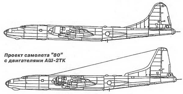 "80" (Ту-80) Дальний бомбардировщик, опытный ![]() Самолет "80"(Tv-80) Жесткая логика начавшегося после окончания второй мировой войны, глобального противостояния СССР с его недавними союзниками, получившего название "Холодная война", требовала с самого начала от ее участников постоянного совершенствования своих военно-технических потенциалов. Каждая сторона, в силу своих возможностей, старалась поддержать этот потенциал и особенно его стратегическую компоненту на уровне, достаточном для гарантированного уничтожения противной стороны. Так постепенно сформировалась то самое "равновесие страха", стабильность которого во многом зависела от способности военно-промышленных комплексов обеих сторон вовремя реагировать на совершенствование стратегических систем вероятного противника, в том числе и авиационных средств доставки ядерного оружия. Запущенный в серийное производство в 1947 году дальний бомбардировщик Ту-4 имел континентальный радиус действия и способен был решать стратегические задачи лишь в пределах Европы, Северной Африки, стран Ближнего и Среднего Востока,а также наносить удары по Японии с дальневосточных баз. Для надежного и гарантированного поражения территории США с авиационных баз в СССР его боевого радиуса действия не хватало. В то же время американские самолеты аналогичного класса и назначения типа В-29 и В-50 могли с авиабаз в Европе, Северной Африке и в Японии накрыть ядерным ковром практически всю европейскую часть СССР и значительную часть советской территории за Уралом. С введением в эксплуатацию межконтинентального стратегического бомбардировщика В-36 это положение для СССР еще больше усугубилось. Необходимо было в срочном порядке создавать стратегический самолет-носитель, способный наносить ядерные удары по США с баз, расположенных на территории СССР или его союзников. Требовался современный носитель с дальностью полета порядка 12000 -14000 км. Уже в 1946-1947 гг. в ОКБ А.Н.Ту-полева начались первые поиски в направлении создания межконтинентального стратегического носителя. Изначально рассматривалась возможность создания сверхдальнего носителя с высокой крейсерской скоростью полета (в полтора - два раза выше, чем у Ту-4), оснащенного ТРД. Однако, проведенные расчеты показали, что, с имевшимися на тот момент ТРД с их сравнительно невысокими абсолютными и удельными показателями, отечественный сверхдальний носитель реально сможет достичь практической дальности полета в пределах 5000-6000 км, что было явно недостаточно. Поэтому, отказавшись на время от использования ТРД, в ОКБ перешли к проектам дальних самолетов с более экономичными поршневыми двигателями. В 1947 г. в Бригаде проектов Б.М.Кондорского, которая в те годы стояла у истоков практически всех новых разработок КБ и в Отделе технических проектов, которым руководил С.М.Егер, начались проектные работы по межконтинентальным стратегическим машинам. В работе находилась целая гамма проектов тяжелых и сверхтяжелых машин (проекты "471", "473", "474", "485", "487", "489" и т.д.) с широким разбросом массо-габаритных параметров, с различными типами силовых установок и с различными подходами к компоновке самолета. Результатом этих масштабных исследований стала выработка перспективной концепции дальнейшего развития типа стратегического самолета-носителя. Практическая реализация 