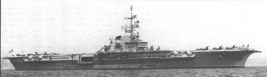 Авианосцы Франции Военный флот Франции в годы Второй мировой войны практически перестал существовать, восстанавливали его в первые послевоенные годы союзники: с 1945 г. по 1956 г. США, Великобритания и Канада передали французам около 200 различных боевых кораблей различных классов, в числе которых было и четыре авианосца. Первым в 1945 г. был получен английский эскортный авианосец "Байтер" (в свою очередь, полученный англичанами в США по ленд-лизу), переименованный в "Диксмюд". Вторым, в 1946 г., арендован в Великобритании сроком на пять лет авианосец "Аррооманш" (бывший "Колоссус"). В 1951 г. и в 1953 г. Франция взяла в аренду в США два авианосца типа "Индепенденс": "Лафайет" (бывший "Лэнгли") и "Буа Бельо" (бывший "Бельо Вуд"). Авианосец "Байтер" использовался в качестве авиатранспорта во время колониальных войн во Вьетнаме и Алжире, выведен из состава флота в 1960 г., в 1966 г. разобран на металлолом. "Лафайет" выведен из боевого состава в 1960 г., а "Буа Бельо" - в 1963 г.; оба авианосца возвращены США. Дольше всех прослужил "Арроманш" (корабль выкуплен у Британии по истечении срока аренды): его карьера завершилась в 1974 г.; разобран на металлолом в 1978 г. В 1957-58 г.г. "Арроманш" прошел модернизацию и был переклассифицирован в противолодочный, а с 1964 г. корабль использовался в качестве учебного. Самолеты, базировавшиеся на "Арроманше", вместе с палубной авиацией английских авианосцев принимали участие в египетской войне 1956 г. Корабли, большей частью устаревшие, переданные Франции союзниками и полученные в счет репараций у побежденных Германии и Италии, не могли составлять костяк национальных ВМС. В результате настоятельных требований военно-морского командования в 1952 г. была принята программа "постоянно растущего флота", предусматривавшая строительство двух авианосцев. Во Франции, как и в большинстве "морских" стран, также считалось, что основой современных ВМС могут быть только авианосцы. Но тип французского авианосца имел "национальные" особенности: в то время как США последовательно увеличивали водоизмещение своих "карриеров", а англичане порывались строить крупные корабли, французы решили, что им больше подходит легкий авианосец. Отчасти это объяснялось задачами, ставившимися перед ВМС страны - защита морских коммуникаций на Средиземном море и в Бискайском заливе, поддержка сухопутных войск, действующих на прибрежных направлениях, наведение при необходимости "порядка" в уцелевших колониях. Не исключалась и возможность нанесения ядерного удара силами палубной авиации, но во главу угла ее французы не ставили. «Клемансо», снимок 1960 г. «Фош» Первый авианосец - "Клемансо" заложили в Бресте в ноябре 1955 г., корабль был спущен на воду в декабре 1957 г., вошел в состав ВМС в ноябре 1961 г. Однотипный с ним "Фош" заложен в феврале 1957 г. на верфи в Сент-Назаре, спущен на воду в июле 1960 г., вошел в строй в июле 1963 г. Эти корабли вместе с атомными подводными лодками составляли ядро французского военного флота на протяжении почти трех десятилетий. В течении своей службы оба корабля прошли модернизацию, в частности их приспособили для базирования истребителей-бомбардировщиков "Супер Этандар". "Клемансо" выведен из состава ВМС в 1997 г., "Фош" продан Бразилии в 2000 г. Решение о строительстве двух атомных кораблей "Бретань" и "Прованс", предназначенных для замены "Клемансо" и "Фоша", было принято в 1980 
