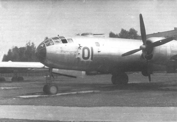 Ту-4 Дальний бомбардировщик![]() Бомбардировщик Ту-4 Прошло несколько лет после окончания второй мировой войны, и бывшие союзники, некогда боровшиеся с общим врагом, перешли к конфронтации между собой. Потенциальным противником номер один для Советского Союза стали США – единственный тогда обладатель ядерного оружия. Но мало было создать атомную бомбу, нужно было еще и суметь доставить ее к цели. У американцев выполнение этой задачи обеспечивало стратегическое командование ВВС. Хотя после окончания войны американская тяжелобомбардировочная авиация значительно уменьшилась численно, зато усилилась качественно. В 1947 г. в строю Стратегического командования имелось 316 самых современных бомбардировщиков. Основу этих сил составляли Боинги В-29 «Суперфортресс» («Сверхкрепость»), поднимавшие до 9 т бомб и имевшие дальность порядка 7000 км. Советский Союз мог противопоставить им 1839 самолетов дальней авиации (так она стала называться с апреля 1946 г.). Цифра, казалась бы, достаточно большая, но реально по своему составу и оснащению дальняя авиация представляла весьма малую в стратегическом отношении ценность. Лишь мизерную часть ее составляли четырехмоторные бомбардировщики – 32 Пе-8 – и примерно столько же американских В-17 и В-24 (использовавшихся главным образом как транспортные). Это были самолеты, спроектированные еще в середине 30-х годов. Весь же остальной парк дальней авиации состоял из устаревших Ил-4, переделанных в ночные бомбардировщики Ли-2 и полученных в свое время по ленд-лизу В-25. Они имели малый радиус действия, не превышавший 1500-2000 км, и бомбовую нагрузку порядка 1,5-2 т. Советское руководство подобная ситуация не могла не беспокоить. В первую очередь остро стоял вопрос о создании собственных самолетов – носителей ядерного оружия, способных «дотянуться» до целей потенциальных противников. Как известно, работы по созданию в нашей стране атомной бомбы были развернуты еще в 1943 г., после получения информации об исследованиях в этой области в США и Германии. Чуть позже приступили и к проектированию дальних бомбардировщиков нового поколения, которые не уступали бы только что попавшему в серийное производство В-29. Первым в мае 1944 г. приступило к работе ОКБ А.Н. Туполева; разработка получила шифр «64». Параллельно проектировались бомбардировщик и пассажирский лайнер: в 1944 г. всем уже было ясно, что война скоро кончится. Основной (военный) вариант самолета «64» представлял собой тяжелый четырехмоторный бомбардировщик, способный днем прорваться в глубокий тыл противника. По замыслу конструкторов, сочетание скорости и высоты полета с мощным оборонительным вооружением обеспечивало самолету практическую неуязвимость даже в условиях противодействия сильной ПВО. Наличие гермокабин давало возможность лететь на высоте 8-10 км. ![]() Схема самолета Ту-4 ![]() В качестве силовой установки нового самолета рассматривался целый ряд перспективных двигателей: АМ-43 ТК-300Б жидкостного охлаждения, АШ-83ФН воздушного, дизеля АЧ-30БФ. Одним из последних был вариант с моторами АМ-46ТК. Все варианты имели несколько отличные тактико-технические данные: например, с АЧ-30БФ дальность с нагрузкой из 5 т бомб составляла 6000-8000 км. Бомбовая нагрузка, в зависимости от радиуса действия, могла достигать 18 000 кг; бомбы калибром до 5000 кг подвешивались внутренне. У В-29 общая наг