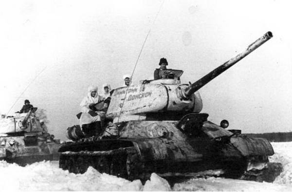Средний танк Т-34-85 (объект 135) ![]() Танки Т-34-85 с пушками Д-5Т. 38-й отдельный танковый полк. Танковая колонна "Димитрий Донской" была построена на средства Русской Православной церкви. Зима 1944 г. Создан на базе танка Т-34 путем установки новой башни с вооружением. Разрабатывался в КБ завода № 183 УВЗ (г.Нижний Тагил). Принят на вооружение Красной Армии постановлением ГКО № 5020сс от 23 января 1944 года. Производился заводами № 183 УВЗ, № 112 "Красное Сормово" ( г. Горький), № 174 (г.Омск). С 1944-го по III квартал 1945 года (то есть до конца Второй мировой войны) изготовлено 21 048 единиц. КОНСТРУКЦИЯ И МОДИФИКАЦИИ Т-34-85 (Д-5Т) – первый серийный вариант завода № 112. Новая трехместная питая башня с неподвижной командирской башенкой, 85-мм пушка Д-5Т с длиной ствола 51.6 клб. Диаметр башенного погона увеличен с 1420 до 1600 мм. Телескопический прицел ТШ-15 и перископический панорамный прицел ПТК. Один башенный вентилятор. Радиостанция в корпусе танка. Боевая масса 30,9 т. Габариты: 8110x3000x2700 мм. Боекомплект: 55 выстрелов и 2745 патронов. Изготовлено 255 единиц. ![]() Сборка башни танка Т-34-85. Уралвагонзавод, 1944 г. ![]() Т-34-85 (ЗИС-С-53) – 85-мм пушка С- 53 или ЗИС-С-53 с длиной ствола 54,6 клб. Командирская башенка сдвинута к корме башни. Изменен электропривод поворота башни. Радиостанция перенесена в башню. Изъят прицел ПТК, введен второй башенный вентилятор, внесены другие мелкие изменения. С марта 1944 г. Т-34-85 начали поступать в части. В первую очередь ими перевооружались гвардейские танковые бригады. В 1944 г. было выпущено 10 499 танков Т-34-85, которые быстро вытесняли из действующей армии Т-34 ранних образцов. Одним из первых Т-34-85 с пушкой Д- 5Т получил 38-й отдельный танковый полк. Эта часть вместе с 516-м отдельным огнеметным танковым полком входила в состав танковой колонны "Димитрий Донской", построенной на средства Русской Православной церкви. На деньги собранные верующими были приобретены 19 танков Т-34-85 и 21 огнеметный ОТ-34. На торжественном митинге 8 марта 1944 г. состоялась передача танков Красной Армии. 10 марта 38-й танковый полк убыл на фронт, где в составе 53-й армии принял участие в Уманско-Ботошанской операции. В заметном количестве Т-34-85 использовались в ходе наступления в Белоруссии, начавшегося в конце июня 1944 г. Они составляли уже более половины из 811 "тридцатьчетверок", принимавших участие в этой операции. В массовом же порядке Т-34-85 применялись в боевых действиях в 1945 г.: в Висло-Одерской, Померанской, Берлинской операциях, в сражении у озера Балатон в Венгрии. В частности, накануне Берлинской операции укомплектованность танковых бригад боевыми машинами этого типа была почти стопроцентной. Так, например, к началу Висло-Одерской операции 3-я гвардейская танковая армия располагала 640 танками Т-34-85 (укомплектованность 103 %), 22 танками-тральщиками Т-34 и 21 танком ИС-2 ( укомплектованность 100%). ![]() Т-34-85 ранних выпусков, о чем можно судить по пушке С-53, отсутствию бонок для крепления запасных траков на лобовой броне корпуса и приборам наблюдений МК-4 без крышечек. 2-й Украинский фронт, Румыния, лето 1944 г. ![]() Т-34-85 позднего выпуска 1944 г. Нештатные грязевые щитки установлены, видимо, в ходе ремонта. Довольно редкий снимок, на котором хорошо видны полностью открытые "ресницы" – броневые крышки призм приборов наблюдения механика-водителя Длинноствольная 85-мм пушка, большее, чем у Т-34, количество приборов наблюдения, повышенн