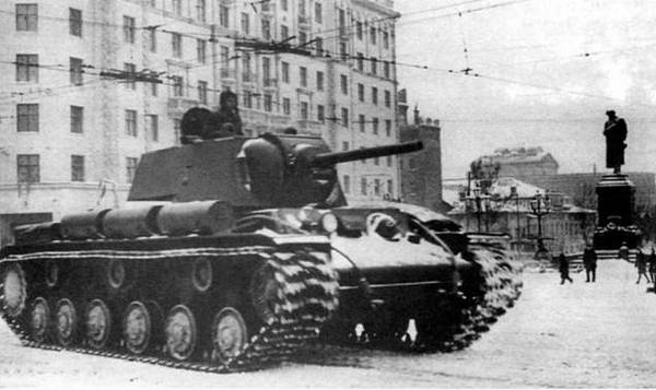 Тяжелый танк КВ ![]() Серийный тяжелый танк КВ-1 со сварной башней и пушкой Л-11. 1940 г. ![]() Танк прорыва. Разработан в 1939 г. в СКБ-2 Кировского завода (г Ленинград) как однобашенный вариант опытного танка СМК. Принят на вооружение Красной Армии постановлением КО при СНК СССР № 443сс от 19 декабря 1939 г. Производился на Кировском заводе, Челябинском тракторном и Челябинском Кировском заводах. С февраля 1940-го по октябрь 1943 года изготовлена 4771 единица. КОНСТРУКЦИЯ И МОДИФИКАЦИИ КВ-1 обр. 1940 г. – первый серийный вариант. Корпус и башня – сварные. коробчатой формы На части танков устанавливались литые башни. Боевая масса 47 т. Габариты 6675x3320x2710 мм. двигатель В-2К. Вооружение: 76-мм пушка Л-11 и 4 пулемета ДТ (1 запасной). Боекомплект 111 выстрелов. 3024 патрона. Бронирование 30…75 мм. Часть танков имела экранированную броню. Экипаж 5 чел. Изготовлено 142 единицы. ![]() Серийный танк КВ-1 выпуска 1941 г. с пушкой Ф-32. Судя по прямоугольным дополнительным топливным бакам на надгусеничной полке, эта машина изготовлена после начала войны ![]() Колонна отремонтированных танков КВ-1 по пути на фронт. Ленинград, весна 1942 г. КВ-1 обр. 1941 г. – 76-мм пушка Ф- 32 с длиной ствола 31,5 калибра, С октября 1941г. – 76-мм пушка ЗИС-5 С длиной ствола 41.5 калибр. Дополнительные топливные баки на надгусеничных полках. На части танков башни упрощенной конструкции, экранированная броня, карбюраторные моторы М-17. КВ-2 – сварная коробчатая башня большого размера. У первых 46 машин отличалась по форме от последующих. Боевая масса 52 т. Габариты 6950x3320x3250 мм Вооружение: 152-мм гаубица М-10 и три пулемета ДТ. Боекомплект 36 выстрелов раздельного заряжания и 3087 патронов Экипаж 6 чел. Изготовлено 213 единиц. КВ-1С – литая башня обтекаемой формы с командирской башенкой. Снижена масса агрегатов силовой передачи и ходовой части. Уменьшена толщина брони. Введена новая коробка передач Изготовлено 1048 единиц. ![]() Танк КВ-1 с упрощенной башней, изготовленный на Кировском заводе в Ленинграде осенью 1941 г. ![]() Экипаж экранированного танка КВ-1 получает боевую задачу, Северо-Западный фронт, 1941 г. KB-8S (объект 239) – КВ- 1С с новой башней и 85-мм пушкой Д-5Т. Башня – литая, обтекаемой формы, с командирской башенкой. Боекомплект 70 выстрелов и 3276 патронов. Ликвидирована шаровая установка курсового пулемета. Боевая масса 46 т. Габариты: 3493x3250x2800 мм. Экипаж 4 чел. Изготовлено 148 единиц. По состоянию на 1 июня 1941 г. в войсках имелось 504 танка КВ. Из этого количества большая часть находилась в Киевском Особом военном округе – 278 машин. Западный Особый военный округ располагал 116 танками КВ, Прибалтийский Особый – 59, Одесский – 10. В Ленинградском военном округе имелось 6 танков КВ, в Московском – 4, в Приволжском – 19, в Орловском – 8, в Харьковском – 4. Из этого количества в эксплуатации находилось 75 КВ-1 и 9 КВ-2 (из них 2 и 1 соответственно требовали среднего ремонта). С 1 по 21 июня в войска с завода был оправлен еще 41 танк КВ. В первые же дни Великой Отечественной войны в полной мере проявились как очевидные достоинства, так и недостатки новых тяжелых танков, равно как и все недочеты в боевой подготовке и организационной структуре танковых войск Красной Армии. В 1941 г. КВ мог поразить любой танк гитлеровского Вермахта, оставаясь при этом практически неуязвимым. Наиболее эффективным средством борьбы с ним были 88-мм зенитные пушки и авиация. Значительное количество этих бое