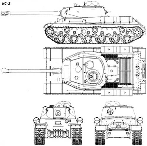 Тяжелый танк ИС-2 ![]() Тяжелые танки ИС-2 проходят по Красной площади. Парад Победы, 24 июня 1945 г. Самый мощный советский танк, принимавший участие в боевых действиях Великой Отечественной войны. Разработан в 1943 г. в КБ Опытного завода N° 100 в Челябинске. Принят на вооружение Красной Армии постановлением ГКО от 4 сентября 1943 г. С октября 1943-го по июнь 1945 г. на ЧКЗ изготовили 3590 единиц. КОНСТРУКЦИЯ И МОДИФИКАЦИИ ИС-1 (объект 237) – базовая модель. Корпус сварной с литой лобовой частью. Литая башня аналогична по конструкции башне ганка КВ-85. Планетарные механизмы поворота. Боевая масса 44 т. Габа- рты 8560x3070x2735 мм. Вооружение: 85-мм пушка Д-5Т и три пулемета ДТ. Боекомплект: 59 выстрелов, 2520 патронов. Экипаж 4 чел, Изготовлено 107 единиц. ИС-2 (объект 240) – ИС-1 с 122-мм пушкой Д-25Т. Пушки на танках первых выпусков имели поршневой затвор. У машин поздних выпусков – сварная лобовая часть корпуса. Принят на вооружение 31 октября 1943 г. Изготовлено 3483 единицы. В феврале 1944 г. имевшиеся в составе Красной Армии полки прорыва, укомплектованные танками КВ, были переведены на новые штаты. Одновременно началось формирование новых частей, оснащенных машинами ИС, которые стали именоваться тяжелыми танковыми полками. При этом им еще при формировании присваивалось наименование "гвардейский". По штату в новых полках насчитывалось 375 человек личного состава, четыре танковые роты ИС (21 танк), рота автоматчиков, рота технического обеспечения, зенитная батарея, саперный, хозяйственный взводы и полковой медицинский пункт. Формирование велось в Тесницком танковом лагере под Тулой. Особенностью экипажа тяжелого танка ИС было наличие в нем двух офицеров – командира танка и старшего механика-водителя и двух сержантов – наводчика орудия и заряжающего (он же младший механик-водитель). Подобный состав экипажей говорит о важности задачи, которая возлагалась на новые машины и вооруженные ими гвардейские полки. Первые три полка (1-й, 29-й и 58-й) поступили в оперативное подчинение командующему 1-й гвардейской армии, которая наносила главный удар в ходе Проскуровско-Черновицкой наступательной операции. Еще два полка (8-й и 13-й) вошли в состав 2-й гвардейской танковой армии и вместе с другими частями приняли на себя основной удар 16-й, 17-й и 1-й немецких танковых дивизий, пытавшихся деблокировать группировку, окруженную советскими войсками у г.Корсунь-Шевченковский Одним из первых вступил в бой 13-й гвардейский тяжелый танковый полк прорыва. 15 февраля 1944 г.. имея в своем составе 21 танк ИС-85, он прибыл в район Фастов – Белая Церковь. После марша полк получил задачу поддержать атаку 109- й танковой бригады на д.Лисянка, для чего командиром полка была выделена рота – пять танков ИС. К моменту вступления ее в бой последние Т-34 109-й танковой бригады, атаковавшие Лисянку в лоб, были подбиты "пантерами", противотанковыми и штурмовыми орудиями немцев. Подпустив ИСы на расстояние 600 – 800 м, немецкие танки и САУ открыли шквальный огонь и в течение 10 минут подбили все наши тяжелые машины, при этом две из них сгорели. Каждый танк получил от 3 до 7 попаданий. На следующий день д.Лисянку окружили и взяли. В ней были захвачены брошенные без горючего 16 "пантер", два Pz.IV и два штурмовых орудия. ![]() Тяжелый танк ИС-85 на заводском дворе ![]() Серийный танк ИС-85 на НИБТПолигоне в Кубинке ![]() ИС-2 ранних выпусков 1944 года. Обращают на себя 