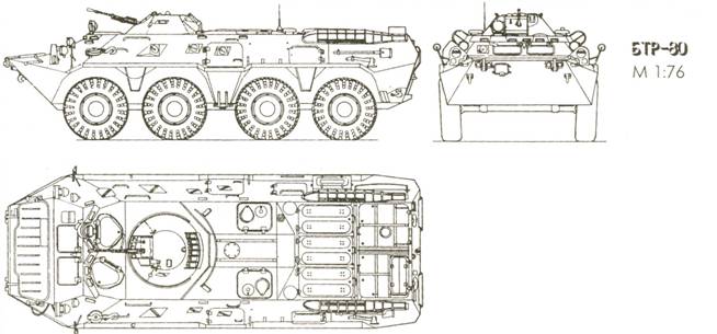 БТР-80 Основным колесным бронетранспортером российской армии в настоящее время является БТР-80 - дальнейшее развитие БТР-70. Эта машина, разработанная под руководством главного конструктора А.Масягина и принятая на вооружение в 1986 году, воплотила в своей конструкции афганский опыт боевого применения бронетранспортеров. БТР-80, разработанный КБ ГАЗ, серийно выпускается на Арзамасском машиностроительном заводе. БТР-80А. Пушка на максимальном угле возвышения На БТР-80 используются двигатели ЯМЗ- 238М2 (240 л. е.). Применены пулестойкие шины КИ-80 или КИ-126, позволяющие машине продолжать движение после полного выхода из строя одного или двух колес. За счет более крупных двухстворчатых боковых люков (нижние секции используются в качестве подножек) значительно упрощено десантирование из бронетранспортера (в том числе и на ходу). По опыту боевого применения бронетранспортера в горных условиях Афганистана значительно расширена зона обстрела из стрелкового оружия десанта. Машина получила усовершенствованную башенную пулеметную установку БПУ-1 с вертикальным углом наведения 60° и новым оптическим прицелом 1ПЗ-2, обеспечивающим возможность зенитной стрельбы. Для постановки маскирующих дымзавес машину оснастили системой 902В, включающей шесть гранатометов, смонтированных на задней стенке башни. БТР-80М На ранних сериях БТР-80 устанавливались радиостанции Р- 123, в дальнейшем замененные па более современные Р-163-50У. В ходе серийного производства в конструкцию машины вносились и другие усовершенствования. Дальнейшим развитием БТР- 80 стал БТР-80А (ГАЗ-59029), принятый на вооружение в 1994 году и в том же году поступивший в серийное производство. Работы по созданию этого бронетранспортера велись АО ГАЗ под руководством А.Масягина в рамках темы «Буйность». Впервые на отечественных машинах такого класса вместо крупнокалиберного пулемета было решено установить мощное 30-миллиметровое автоматическое орудие 2А72 с боекомплектом 300 снарядов, созданное в КБП под руководством А.Шипунова на базе пушки 2А42, применяемой на БМП- 2, БМД-2 и БМД-3, а также боевых вертолетах Ка-50/52 и Ми- 28. Характеристики бронетранспортеров типа БТР-70 и БТР-80 Конструкция новой башни позволяет вести огонь на больших углах возвышения (до 70°), поражая самолеты и вертолеты противника на дальности до 4000 м. С пушкой спарен 7,62- мм пулемет ПКТ (боекомплект - 2000 патронов). Все вооружение размещено на лафете, вынесенном за пределы обитаемого отсека, что уменьшает загазованность внутренних помещений машины при стрельбе. На БТР-80А установлен танковый ночной прицел ПЛЧ З-42 «Кристалл», позволяющий в ночных условиях поражать цели на дальности до 900 м. Для внутренних войск МВД в 1994 году создан и запущен в производство на АО АМЗ более простой вариант бронетранспортера - БТР-80С, отличающийся от БТР-80А «главным калибром»: вместо пушки на машине установлен 14,5-мм пулемет КПВТ. Создан БТР-80М с двигателем ЯМЗ-238 и шинами КИ- 128 с увеличенной пулестойкостью. На базе БТР-80 разработаны и выпускаются многочисленные бронированные машины специального назначения. В частности, было создано несколько типов командно-штабных машин, машина управления артиллерии 1В118, станция спутниковой связи с крупногабаритной антенной и ряд других машин. На базе БТР-80 также создана машина огневой поддержки. На крыше корпуса во вращающейся ба