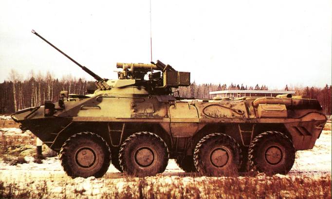 КОМАЦУ «ТИП 87» Первые восемь БРМ «87» поступили на вооружение японских сил самообороны в 1988 году. Два прототипа проходили испытания в 1984-1986 тт. Планируется закупить 250 БРМ, поставки продолжаются. В отличии от бронеавтомобиля «82», БРМ имеет другую компоновку, хотя на 80% конструктивно аналогична командно-штабной машине. Моторно-трансмиссионное отделение находится в кормовой части машины справа. В средней части установлена двухместная вращающаяся башня с 25-мм автоматической пушкой Эрликон КВА и спаренным с ней пулеметом «74» калибра 7,62 мм. Сиденье командира находится справа от пушки, стрелка-наводчика - слева. На крыше находится командирская башенка с шестью смотровыми приборами. Над сиденьем наводчика расположен круглый люк, перед которым установлен один неподвижный перископ, еще один неподвижный перископ смонтирован слева от люка. На бортах башни установлено по три гранатомета для стрельбы дымовыми гранатами. БРМ «Тип 87» В передней части машины расположены места водителя (с правой стороны) и радиста (с левой стороны). Над сиденьем водителя в наклонном бронелисте имеется круглый люк, обзор обеспечивается тремя неподвижными перископическими наблюдательными приборами. Люк радиста имеет прямоугольную форму, в нем установлен один перископический прибор, формой и местом расположения этот люк очень похож на люк механика-водителя танка Т-34. В задней части машины находится место наблюдателя. Обзор задней полусферы - через неподвижный перископ. Корпус машины сварной из стальных бронелистов, в левом борту имеется дверь. БРМ не является амфибией. Технические характеристики Колесная формула 6x6 Боевая масса, кг 15.000 Длина корпуса, м 5,37 Длина с пушкой вперед, м 5,99 Ширина, м 2,48 Высота по крыше башни, м 2,80 Колесная база, м 1,50/1,50 Дорожный просвет, м 0,45 Максимальная скорость по шоссе, км/ч 100 Запас хода по шоссе, км 500 Преодолеваемые препятствия: глубина брода, м 1 высота стенки, м 0,6 ширина траншеи, м 1,5 Экипаж, чел 5 БТР-80 с элементами динамической защиты. Войсковая доработка. БТР-80. Учения морской пехоты. северный флот 1998 г. Доработанные в части БТР-80 с гранатометом АГС-17 на башне БТР-80 Зубастый БТР-80 с гранатометом АГС-17 БТР-80 АК БТР-80 А БТР-80 А с сетчатыми экранами для защиты от противотанковых гранат. Войсковая доработка БТР-90 с дополнительной броней БТР-80 АК Вид 3/4 сзади БТР-90 с дополнительной броней. Осень 1999 года БТР-90 |
