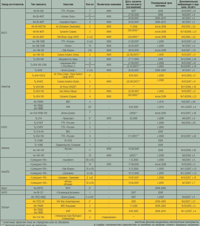 В преддверии подъема -2 Время еще не пришло? Российское гражданское самолетостроение в 2007 г.Ровно год назад мы опубликовали статью «В преддверии подъема», в которой рассмотрели основные результаты работы авиастроительной отрасли России в 2006 г. в области производства и поставок пассажирских и транспортных самолетов (см. «Взлёт» №1-2/2007, с. 14-17). Тогда пришлось констатировать, что объем производства гражданской авиатехники практически не изменился по сравнению с предыдущим годом (было построено всего восемь магистральных авиалайнеров). Вместе с тем создание Объединенной авиастроительной корпорации, формирование ее продуктового ряда и заключение ряда новых контрактов и соглашений с российскими и зарубежными заказчиками позволяли надеяться на серьезные улучшения в этой области начиная уже с 2007 г. Но прошел год, и его итоги неумолимо свидетельствуют: ожидавшегося подъема пока не произошло. Объем производства отрасли по-прежнему остался на уровне восьми (с учетом ташкентского завода – девяти) магистральных пассажирских и транспортных самолетов. В это же время в страну поступило 60 зарубежных лайнеров (правда, новых среди них – только девять). Однако в течение года произошло несколько важных событий, вселяющих осторожный оптимизм относительно перспектив отечественного гражданского авиапрома. Во-первых, были утверждены производственные планы ОАК, предусматривающие выпуск в течение пяти предстоящих лет уже 431 пассажирского и грузового самолета. Во-вторых, удалось заключить ряд очередных контрактов и соглашений на поставку новых лайнеров российским и зарубежным перевозчикам, а ведущая лизинговая компания страны – «Ильюшин Финанс Ко.» (ИФК) – разместила на заводах несколько крупных заказов на производство самолетов семейств Ил-96, Ту-204 и Ан-148. Речь идет уже не о достройке машин из имевшихся производственных заделов, а о закладке и изготовлении совершенно новых самолетов. Наконец, наметился серьезный прогресс в программах перспективных региональных лайнеров «Суперджет-100» и Ан-148. Случится ли долгожданный подъем в 2008 г. – станет ясно ближе к следующей зиме. Пока же рассмотрим, что все-таки удалось сделать нашей промышленности в году прошедшем и чего можно ожидать в наступившем. Для внутреннего рынка В течение 2007 г. российским авиакомпаниям было поставлено шесть новых отечественных магистральных самолетов: по одному Ил-96, Ту-214, Ту-154М, Ан-140, Бе-200 и Ил-76 (с учетом объявленных планов предстоящего вхождения Ташкентского авиационного производственного объединения им. В.П. Чкалова (ТАПОиЧ) в состав ОАК будем рассматривать его наряду с российскими заводами). При этом поставленный Казанским авиационным производственным объединением им. С.П. Горбунова (КАПО) минувшей весной компании «Трансаэро» ее первый средне-дальнемагистальный самолет Ту-214 был выпущен еще в 2006 г. (контракт на производство десяти Ту-214 для «Трансаэро» на КАПО осуществляется Финансовой лизинговой компанией). Остальные машины построены в течение 2007 г. Дальнемагистральный Ил-96-300 изготовлен Воронежским акционерным самолетостроительным обществом (ВАСО) по заказу лизинговой компании ИФК и поставлен ГТК «Россия» для Управления делами Президента России. Среднемагистральный Ту-154М построен самарским заводом «Авиакор» для администрации Самарской обл. Выпущенный т