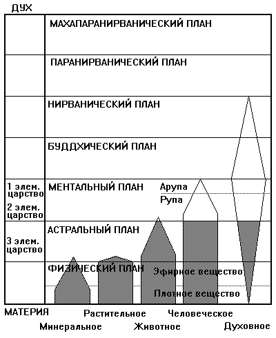 Глава VI ПЕРВАЯ ЭМАНАЦИЯ Первое движение, ведущее к формированию системы, приходит именно из Третьего аспекта. До этого движения материя существует лишь в атомическом состоянии на каждом из уровней природы. Ни одна из групп или комбинаций, из которых состоят нижние подуровни (подпланы) каждого плана, еще не сформирована. Но в это море девственной материи (истинная Дева Мария) нисходит Дух Святой — "даритель жизни", или «животворящий», как его называют в Никейском символе веры. Под действием его величественной жизненнности единицы, или основные элементы материи, пробуждаются к новым возможностям и силам — притяжения и отталкивания, — так появляются низшие подразделения каждого уровня. Как мы видим, на диаграмме это символизируется линией, спускающейся из нижнего круга прямо через все уровни. При этом линия становится всё толще и темнее, что показывает, как Божественный дух при нисхождении всё больше и больше облачается в материю, так что в нем будет невозможно узнать божественное. Но живая энергия здесь всё-таки присутствует, даже тогда, когда она строго ограничена самыми низшими формами. В ожившую материю нисходит вторая великая эманация Божественной Жизни. Это означает, что второе Лицо Троицы получает форму из девственной (непродуктивной) материи, в которой уже пульсирует жизнь третьего Лица Троицы. Жизнь и материя облачают Второе Лицо подобно одежде. Следовательно, Второе Лицо Троицы рождено от Духа Святого и Девы Марии, что представляет собой истинное толкование основного положения христианского Символа Веры. Очень медленно и постепенно это течение нисходит через разные уровни и царства. В каждом из них оно проводит определенный период времени, который равен времени существования целой инкарнации планетарной цепи, а этот период, если его измерять нашими временными мерками, длится многие миллионы лет. На рис. 2 это движение символизируется линией, которая в виде кривой спускается слева от второго круга, постепенно темнея по мере приближения к своей низшей точке. После прохождения этой точки начинается восходящая часть дуги, поднимающейся через физический, астральный и низший ментальный уровень до тех пор, пока не встретится с третьей великой эманацией, что изображается линией, выходящей из самого верхнего круга и представляющей собой правую сторону большого овала. Об этой встрече эманаций мы расскажем немного позже, но сейчас необходимо обратить внимание на нисходящую дугу слева. Рис. 3. Инволюция и эволюция Для лучшего понимания обратимся к рис. 3. Хотя эта диаграмма выглядит совсем иначе, она соответствует диаграмме на рис. 2. Узкий столбец слева соответствует нисходящей дуге на рис. 2 слева, а все пирамидальные фигуры, которые составляют остальную часть диаграммы, изображают восходящую часть дуги рис. 2 справа в разных фазах ее роста. Заметим, что в различных фазах своего нисхождения она называется разными терминами. В целом, мы будем ее называть монадической эссенцией, особенно тогда, когда она окутана лишь самой высокой и самой тонкой материей различных уровней. Но, когда в своем нисхождении она оживляет материю высшей части ментального уровня, ее называют первым элементальным царством. В течение одной планетарной цепи эта волна нисходит на низший (или рупа) уровень того же плана. В следующий период планетарной