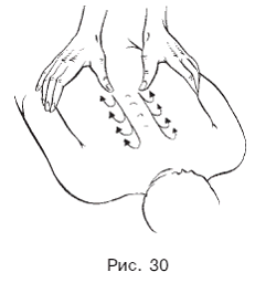 При выполнении кругообразного поглаживания пальцы рук должны быть немного разведены в стороны. Массажист производит поглаживание подушечками четырех пальцев, опираясь на большой палец. При выполнении данного приема кожа захватывается в складку, пальцами производится вращательное движение, а затем кисть возвращается в исходное положение. Кругообразное поглаживание ладонью производится в среднем темпе, поглаживание выступом большого пальца – в медленном. В этом случае массирование будет глубоким. Для более сильного воздействия на участок применяется также поглаживание основанием ладони и пальцами, сжатыми в кулак. Движение может быть продольным, поперечным или по диагонали. В любом втором случае кругообразное поглаживание выполняется не только ординарно, но и с отягощением. Граблеобразное поглаживание проводится подушечками четырех пальцев, немного разведенных в стороны. Кисть руки приподнята над массируемым участком и находится к нему под углом 60—70°. Прием выполняется чаще всего обеими руками, реже одной. Руки идут навстречу друг другу, собирая кожу в складку. Кисти руки могут двигаться в прямом направлении, то есть сверху вниз и снизу вверх, и по диагонали. Граблеобразное поглаживание может проводиться и одной рукой, но обязательно с отягощением. Гребнеобразное поглаживание выполняется фалангами согнутых пальцев, плотно прижатых друг к другу или чуть разведенных в стороны. Кисть руки массажиста при этом приподнята и располагается почти под прямым углом к массируемому участку. Если костные выступы касаются кожи без нажима, то поглаживание будет поверхностным, если же давление чуть сильнее, то поглаживание более глубокое. Данный прием массажисты выполняют двумя способами: 1) внутренние стороны ладоней обращены друг к другу, кончики согнутых пальцев при движении соприкасаются; 2) кисти рук развернуты тыльными сторонами друг к другу. При выполнении приема они будут соприкасаться на массируемом участке. Данный вид массажа можно выполнять с отягощением. Завершающим приемом поглаживания является глажение (рис. 29). Оно проводится как одной, так и двумя руками. Глажение выполняется тыльными сторонами пальцев, согнутых под прямым углом. Нередко массажисты используют комбинированное глажение. Сначала прием проводится двумя руками, затем одной рукой с отягощением и снова двумя руками. В процессе массирования смена положения рук может происходить 6-7 раз. Глажение завершает серию поглаживаний, после него можно переходить к растиранию. Растирание При бронхиальной астме и хроническом бронхите применяются такие виды растирания, как поперечное, продольное, прямолинейное, зигзагообразное, спиралевидное, S-образное, вилкообразное, кругообразное, граблеобразное, гребнеобразное, штрихование, пиление, пересекание. Каждый из этих приемов включает в себя несколько подвидов, имеет различные техники выполнения. Прямолинейное растирание выполняется концевыми фалангами большого и четырех остальных пальцев, ладонью, основанием ладони, пальцами, сжаты ми в кулак. Прямолинейное растирание может проводиться сверху вниз и снизу вверх по всему массируемому участку, а также по диагонали. Если массирование проводится концевыми фалангами больших пальцев, то четыре пальца могут быть согнуты и двигаться по коже чуть впереди больши